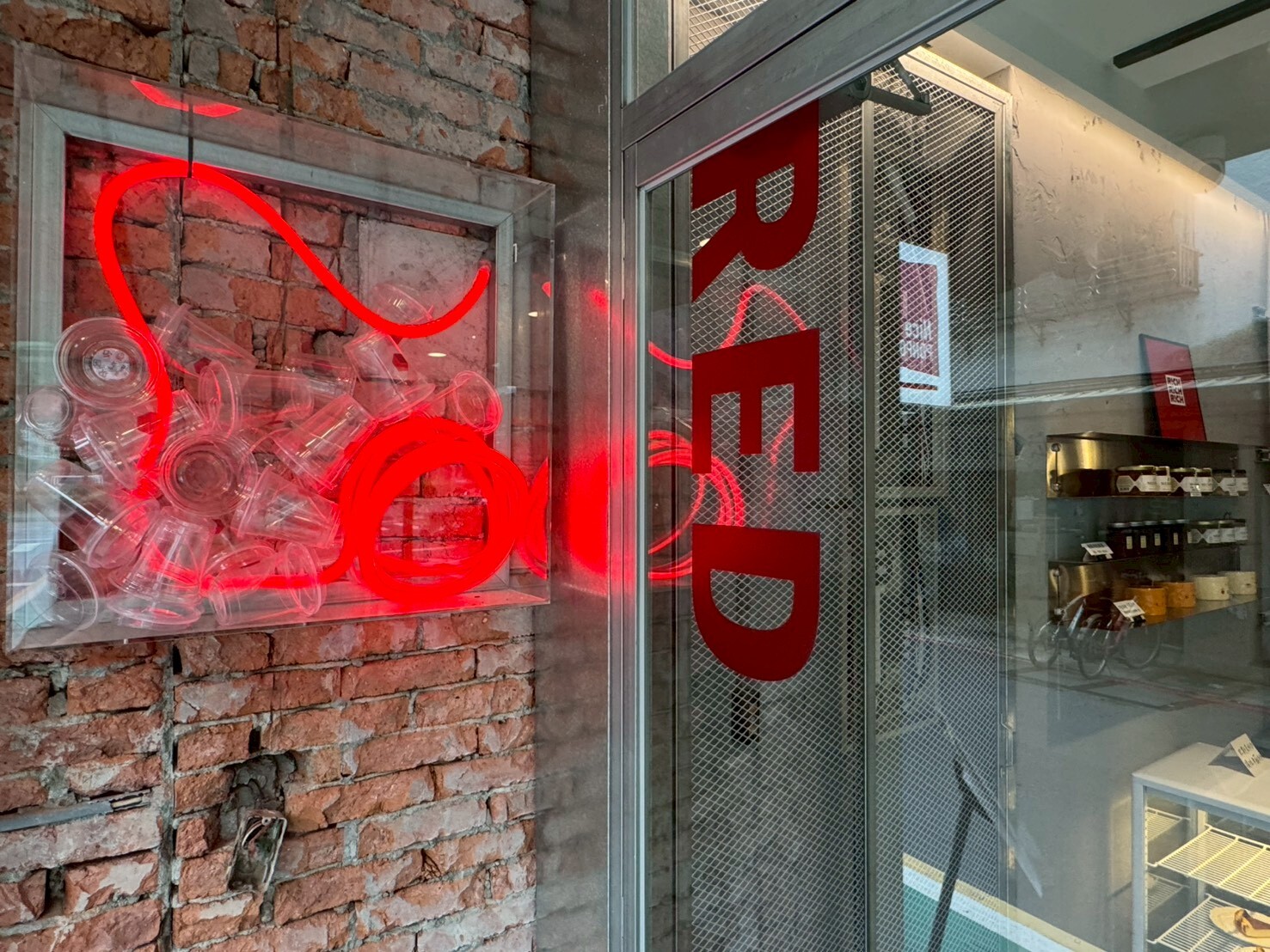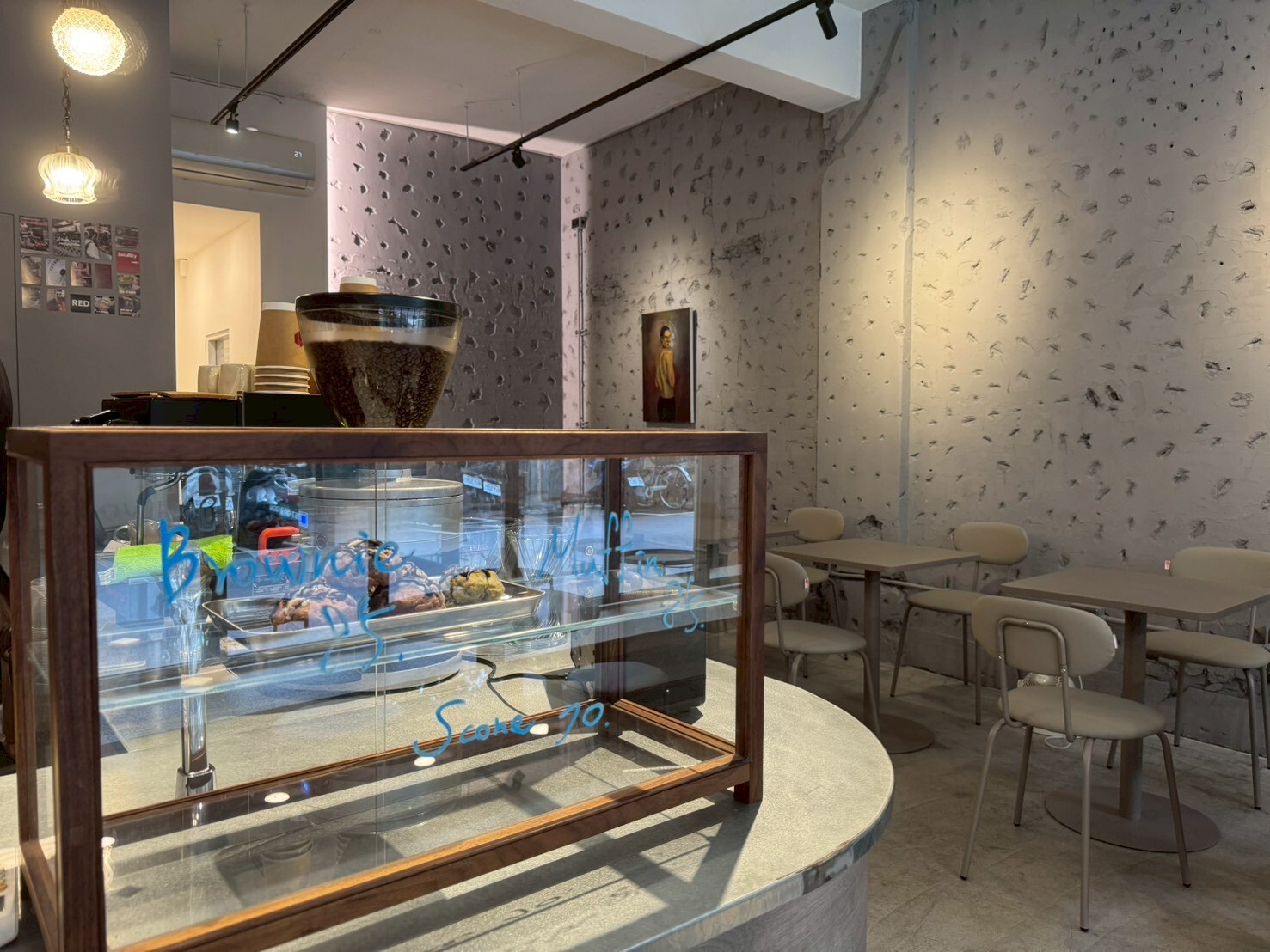 COFFEE RED 在裝潢上以水泥灰地板、大量金屬線條與裸露裝修細節為主調,搭配大面落地窗與可打開折門設計,營造出室內與戶外通透的感受。